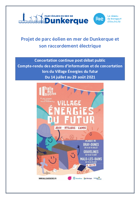 La concertation et l’information du public continuent pour l’équipe raccordement du projet de parc éolien en mer de Dunkerque, présente tout l’été 2021 sur le Village des Énergies du futur organisé par la Halle aux Sucres.