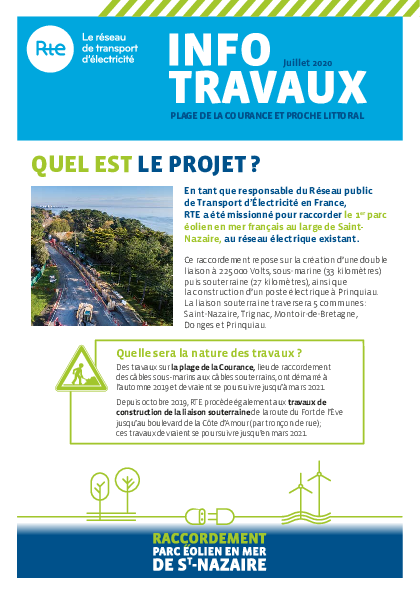 L’opération de déroulage a démarré dimanche 9 août, avec la présence du navire câblier le Cable Enterprise, long de 124 mètres, à environ 700 mètres de la plage. Ces travaux de déroulage ont commencé par la mise en place du câble à l’entrée du fourreau, avec l’aide de plongeurs professionnels, puis son tirage jusqu’à la chambre de jonction (coffre maçonné) située en haut de la plage de la Courance. A partir du mercredi 12 août, le navire se dirigera vers le banc de Guérande, en procédant au déroulage/ensouillage du câble (à environ 1,5 m de profondeur) avec l’aide d’une charrue, sur une distance d’environ 30 km qui l’amènera jusqu’à la zone du futur parc éolien.