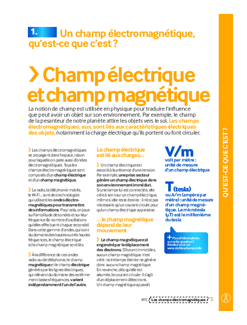 Pour les usages courants de l’électricité (en basse fréquence), champ électrique et champ magnétique sont disjoints. Le champ électrique est lié à la tension; il est présent dès que l’on branche un appareil, même si le courant ne passe pas. Il se mesure en volt par mètre (V/m). Le champ magnétique est lié au courant et n’apparaît que si un courant est consommé, autrement dit si l’appareil électrique est allumé. Il se mesure en tesla (T).
