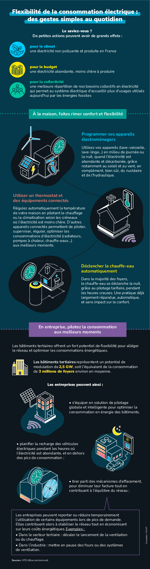 - Dans le secteur tertiaire (bureaux, administrations, commerces, enseignement…), la flexibilité n’est pas encore très développée, mais cela démarre ! Elle pourrait consister à utiliser l’inertie thermique des bâtiments pour décaler une partie du chauffage, de la ventilation et de la climatisation, et à piloter les bornes de recharge pour utiliser les heures les plus favorables de la journée. Le tout à confort et service inchangés !