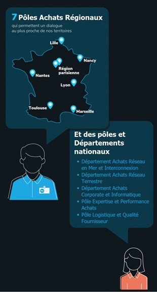 La Direction des Achats et Supply Chain de RTE s’organise autour de Pôles Régions et de Départements/Pôles Nationaux.