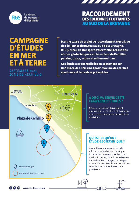 En tant que maître d’ouvrage en charge du raccordement électrique, RTE a participé dès 2020 au Débat Public (CNDP) et mené la concertation sur le projet à partir de 2021. L’aire d’étude a été validée en 2022 puis le fuseau de moindre impact en 2023. Une seconde phase de concertation se poursuit actuellement pour pouvoir proposer lors de l’enquête publique prévue en 2026, un tracé général des liaisons terrestres et sous-marines ainsi que la localisation précise de l’implantation des postes électriques en mer et à terre.