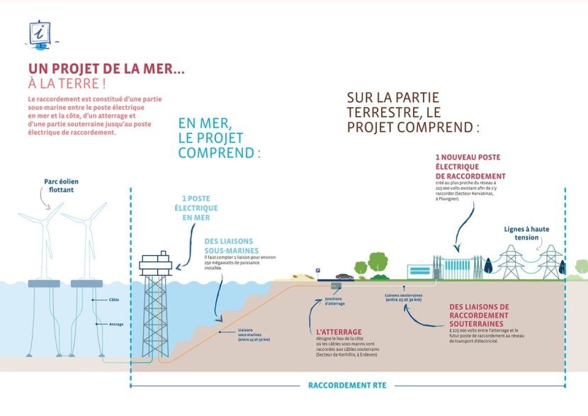 Le raccordement est constitué d’une partie sous-marine entre le poste électrique en mer et la côte, d’un atterrage situé sur la commune d’Erdeven et d’une partie souterraine jusqu’au poste électrique de raccordement, construit sur la commune de Pluvigner.
