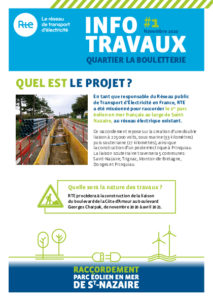 Travaux : Une première phase de travaux a été engagée à l’été 2018 pour le poste de Prinquiau. Dès septembre 2019, l’ensemble des travaux de raccordement du parc offshore démarre avec la réalisation des travaux de génie civil sur la plage de La Courance à Saint-Nazaire (jonction des câbles sous-marins aux câbles souterrains) puis des travaux pour la réalisation de la liaison souterraine, sur les cinq communes traversées.