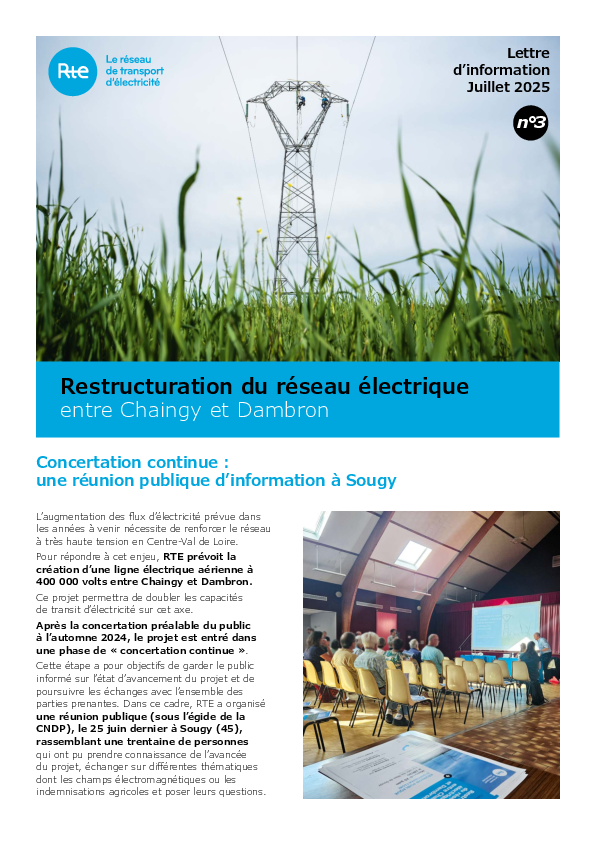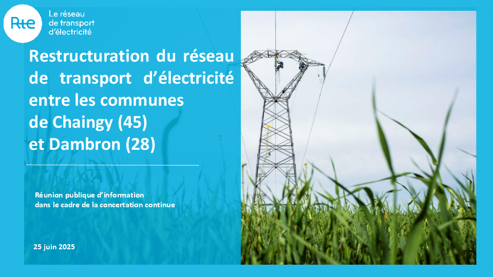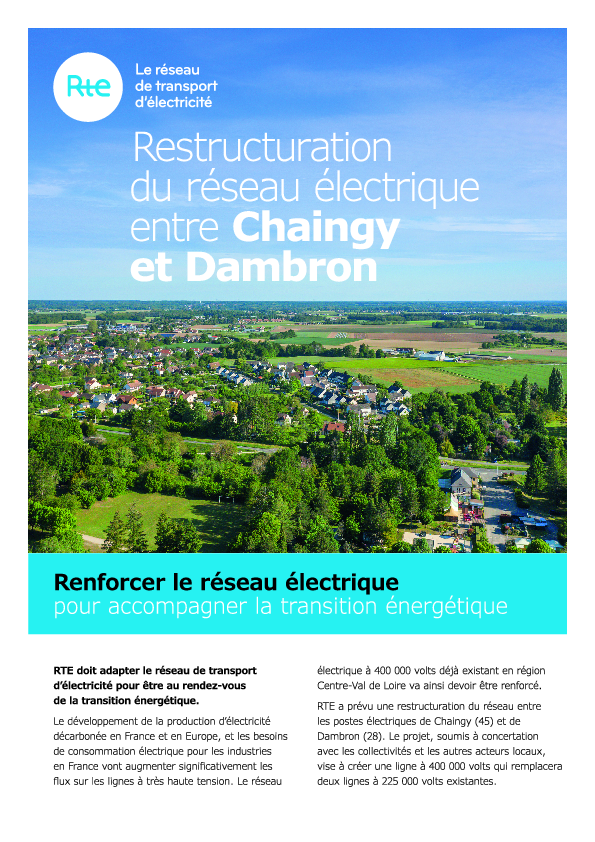 Le développement de la production d’électricité décarbonée en France et en Europe, et les besoins de consommation électrique pour les industries en France vont augmenter significativement les flux sur les lignes à très haute tension. Le réseau électrique à 400 000 volts déjà existant en région Centre-Val de Loire va ainsi devoir être renforcé. RTE a prévu une restructuration du réseau entre les postes électriques de Chaingy (45) et de Dambron (28). Le projet vise à créer une ligne à 400 000 volts qui remplacera deux lignes à 225 000 volts existantes.