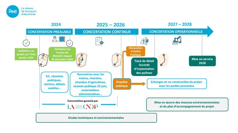 L’entreprise Eiffage, chargée des études de la future ligne, participera à ces rendez-vous pour apporter un éclairage technique et recenser les propriétaires des parcelles concernées. Des conventions devront être établies à l’amiable pour l’implantation des pylônes et des surplombs associés.