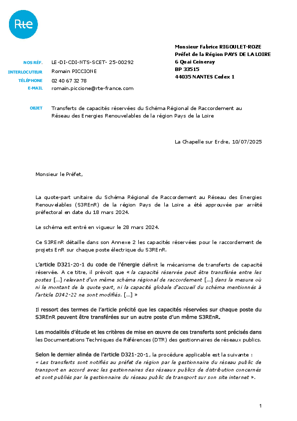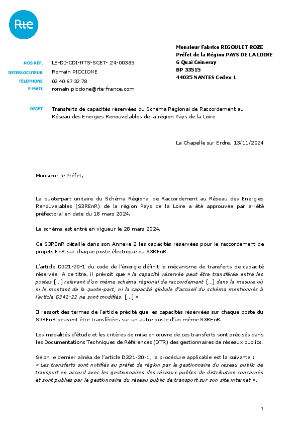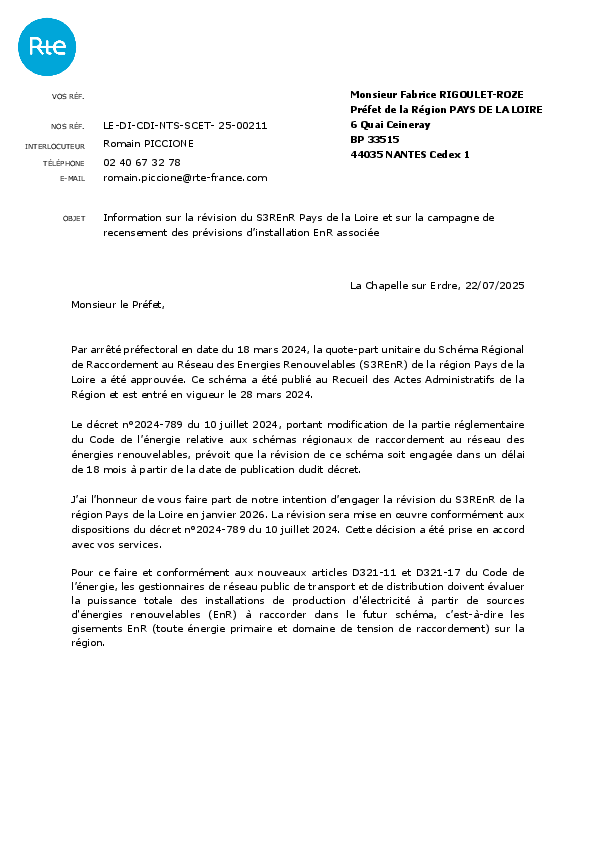 Le 2e S3REnR Pays de la Loire est entré en vigueur le 28 mars 2024. Il est établi sur la base d’une capacité d’accueil globale fixée par le préfet de région en tenant compte de la Programmation Pluriannuelle de l'Énergie (PPE), du Schéma Régional d’Aménagement, de Développement Durable et d’Égalité des Territoires (SRADDET, qui remplace le SRCAE) et de la dynamique des demandes de raccordement attendue.