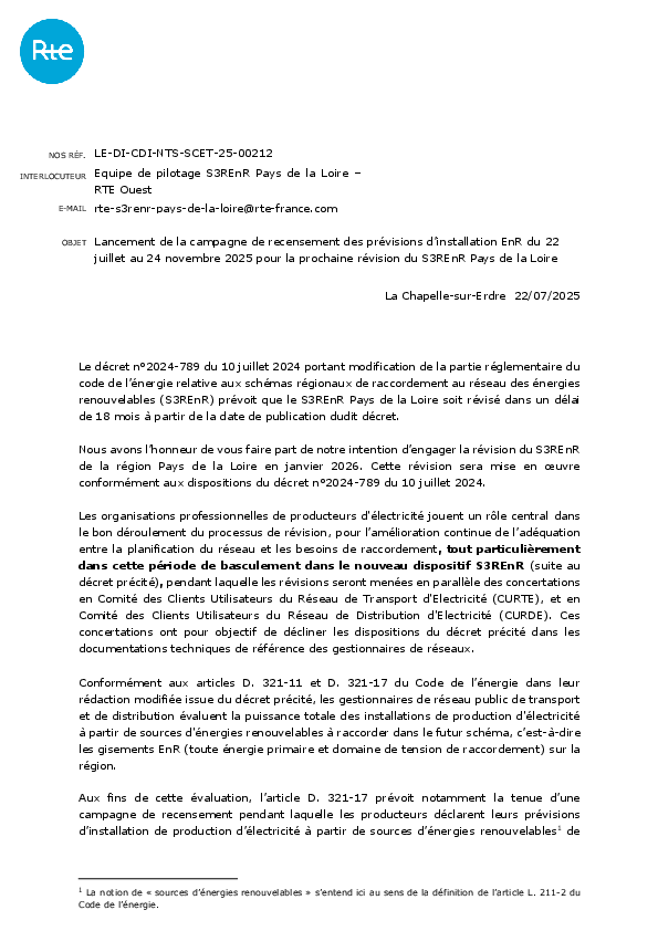 La campagne de recensement des prévisions d’installations EnR en vue de la révision du S3REnR Pays de la Loire se déroulera du 22 juillet 2025 au 24 novembre 2025.